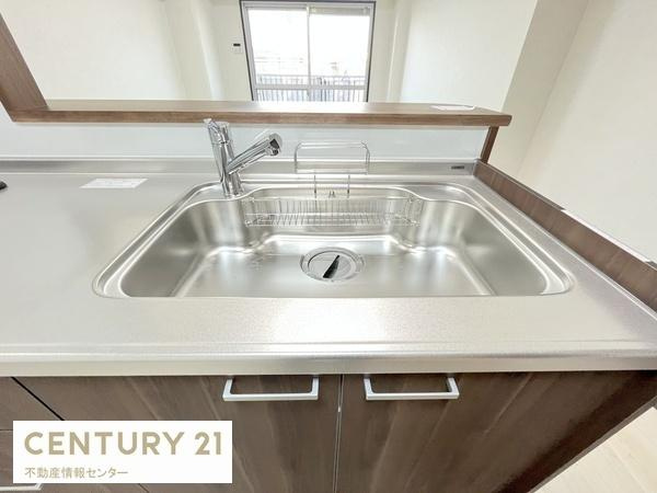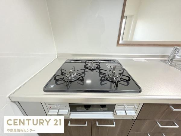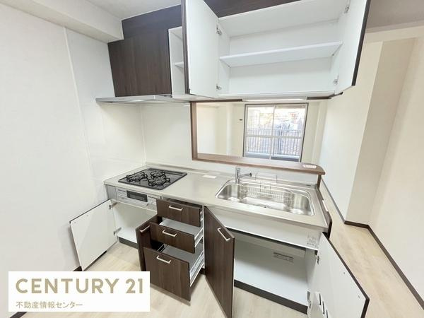 キッチンスペースの広いキッチンはリビングを見渡せるシステムキッチン!